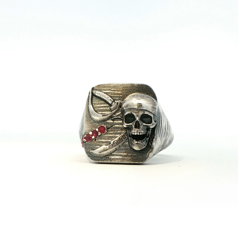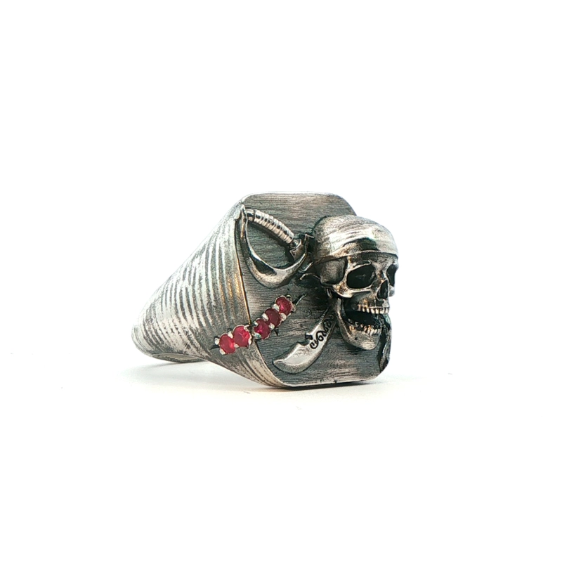 Capturó un gran mercante francés, al que renombró como The Queen Anne´s Reverenge, que armó con 40 cañones y con el que logró derrotar a un barco de la Real Armada Británica. Una personalidad contundente reflejada en un anillo curtido por mil batallas que incorpora un tesoro de 5 rubíes naturales.