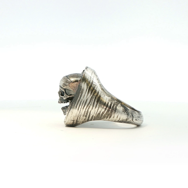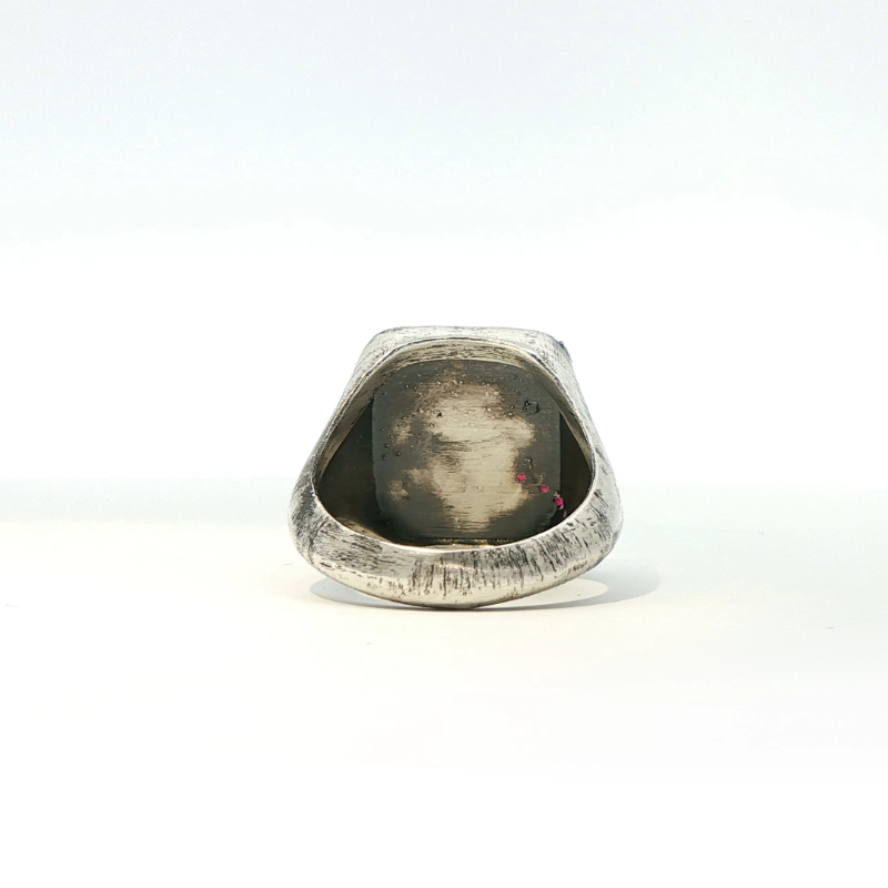 - Anillo elaborado en plata de Ley con acabados brillantes y mate, sobre un fondo patinado.