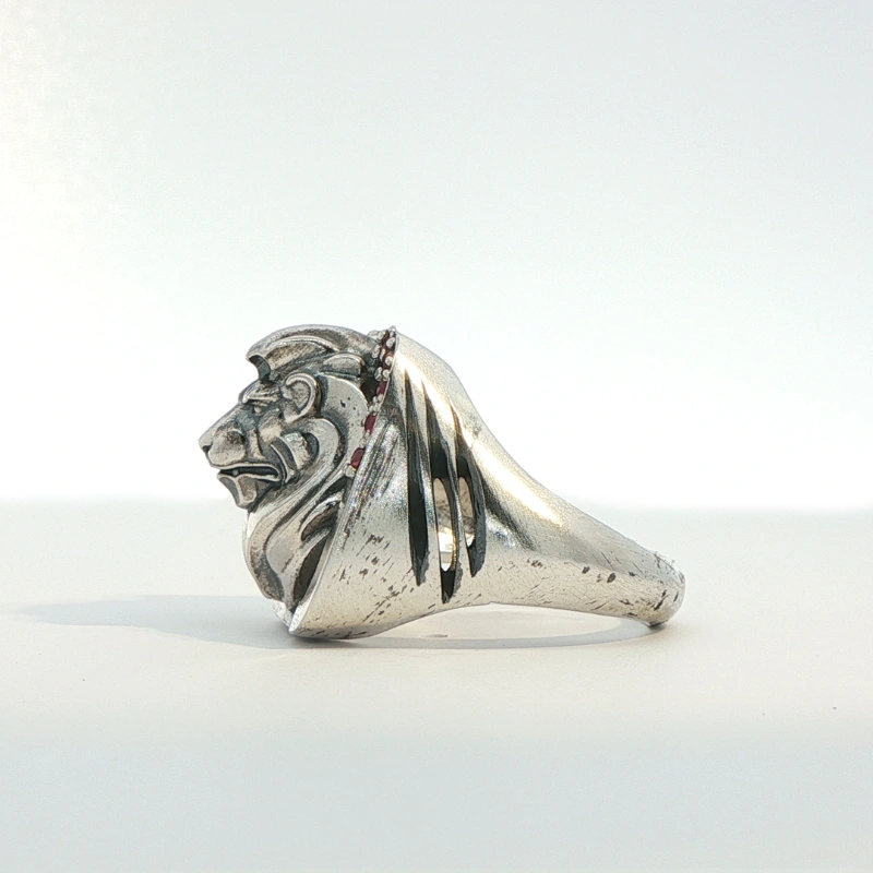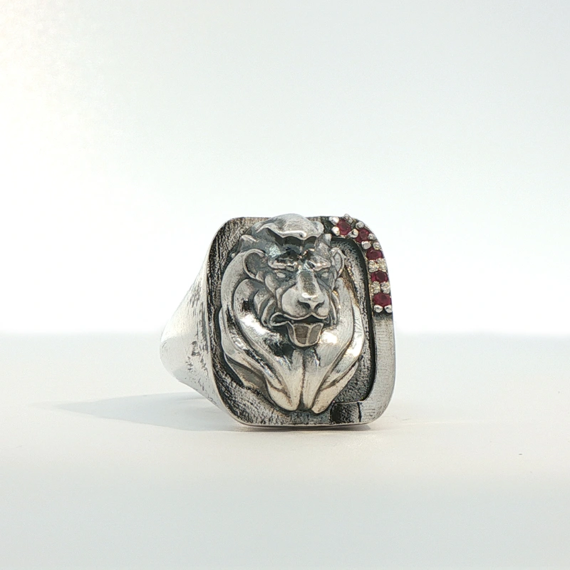 El león es un animal que trasmite elegancia y poder por igual. Esa es precisamente la sensación que buscamos para esta joya. Líneas armónicas que definen la imagen de esta figura representada sobre plata de Ley con un contorno de rubí natural.