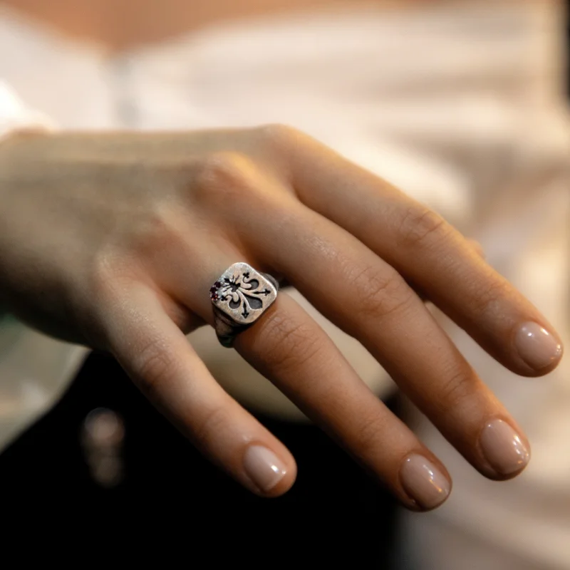 - Anillo elaborado en plata de Ley con acabados brillantes y mate, sobre un fondo patinado.