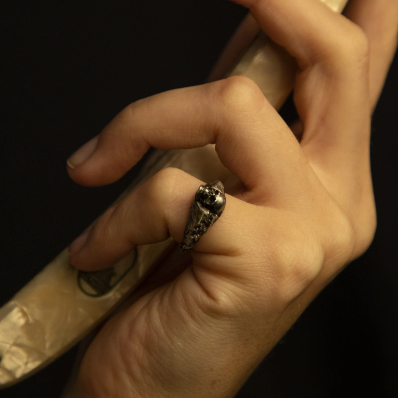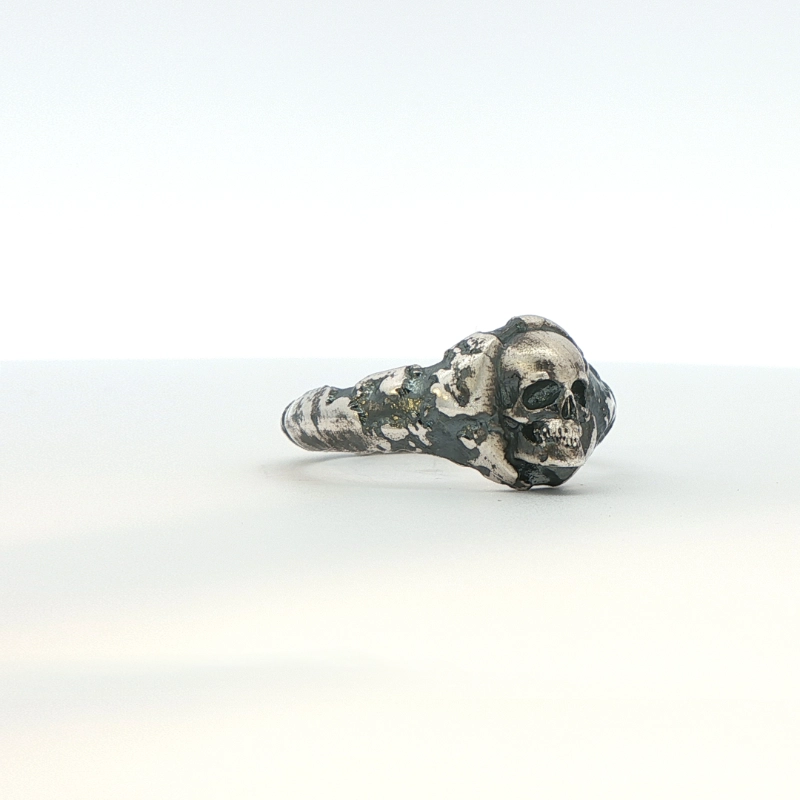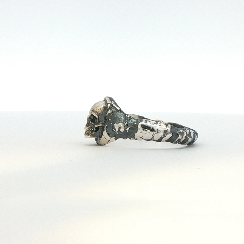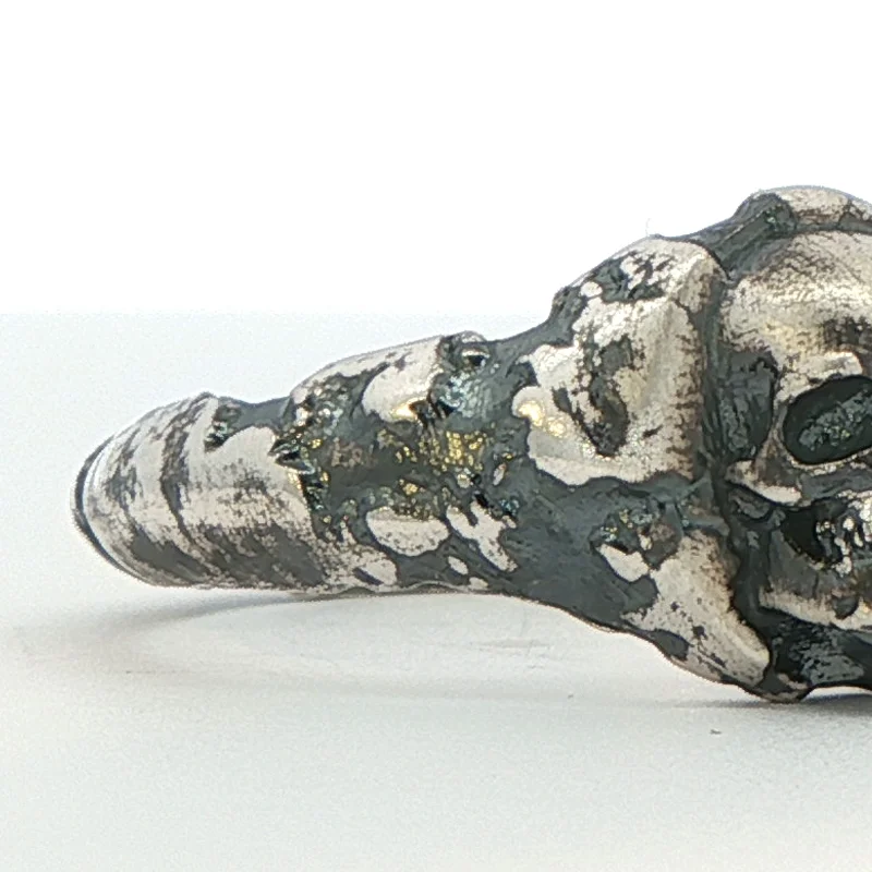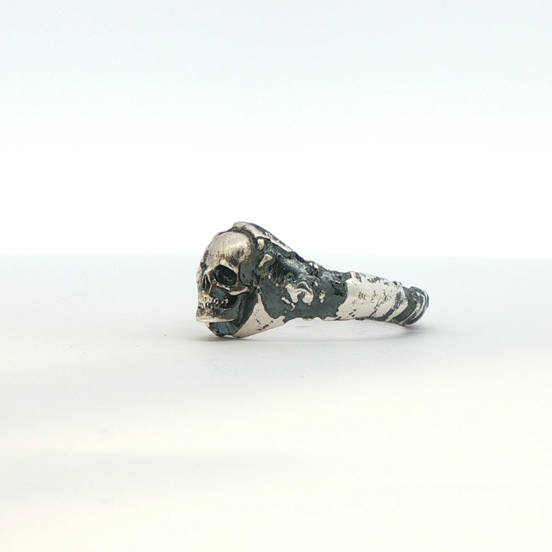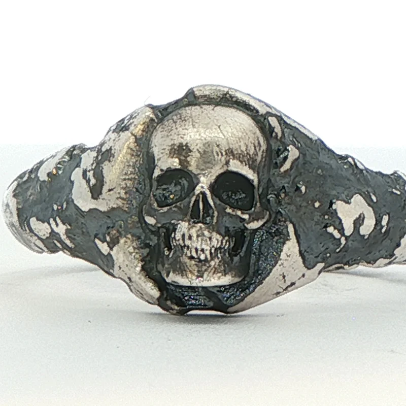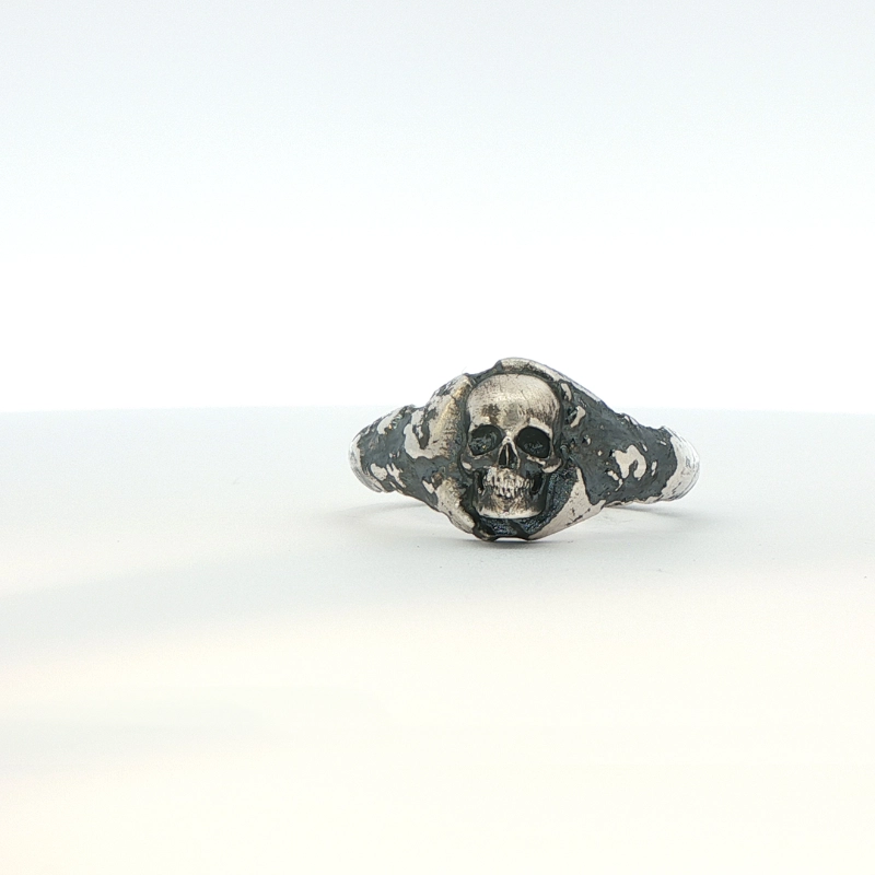 Como representación de esta parte de la colección, tallamos un cráneo reducido en plata de Ley sobre un sello mini y una definición enorme.