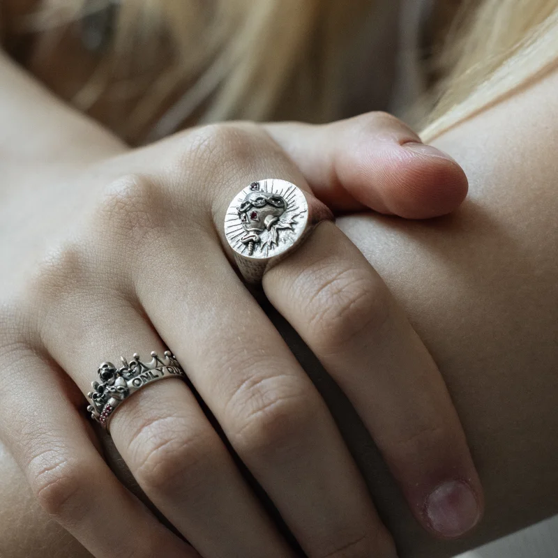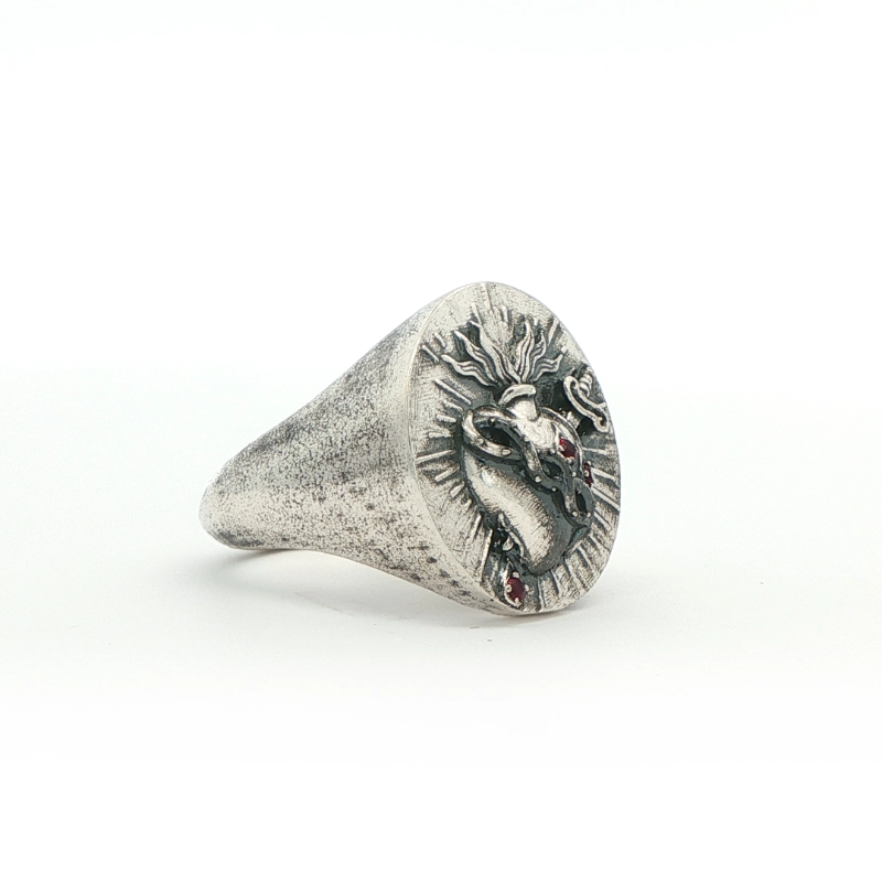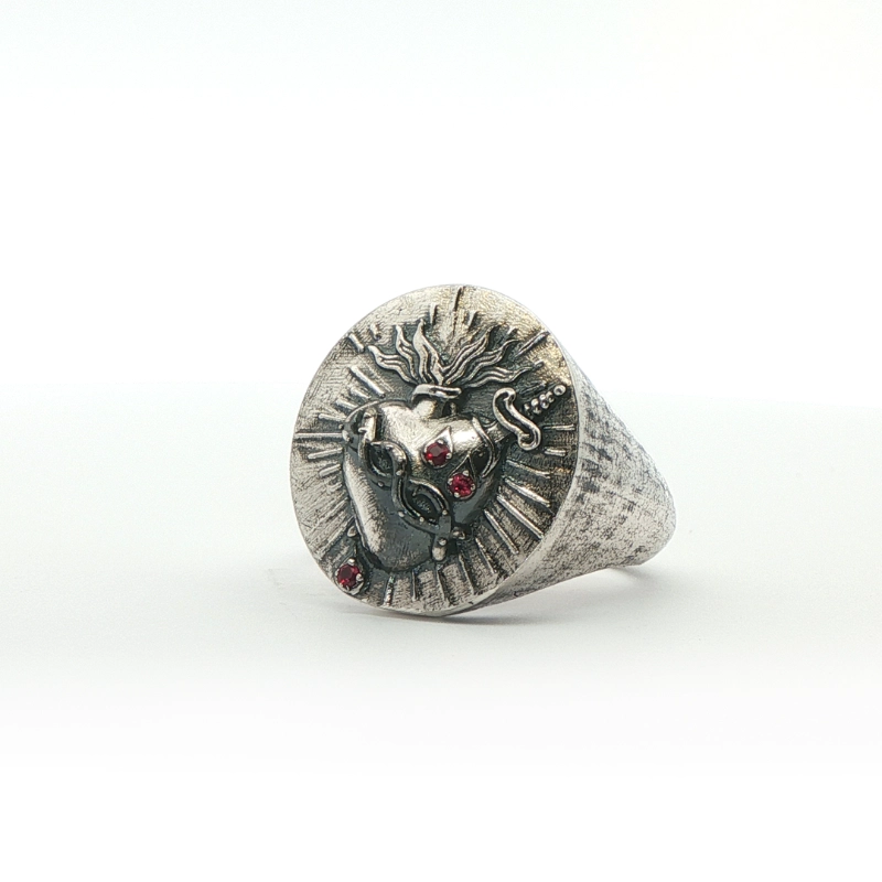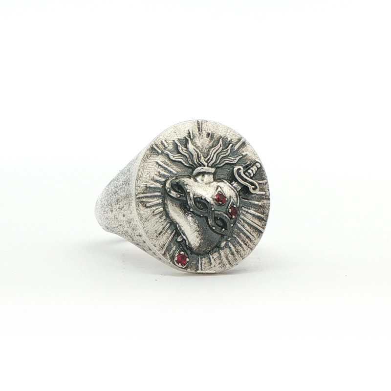 Nosotros hemos querido trasladar esta tendencia sobre plata de Ley, donde la tradición artesanal del oficio y estética del tatuaje convergen en forma de joya donde destacan tres destellos de rubí natural.