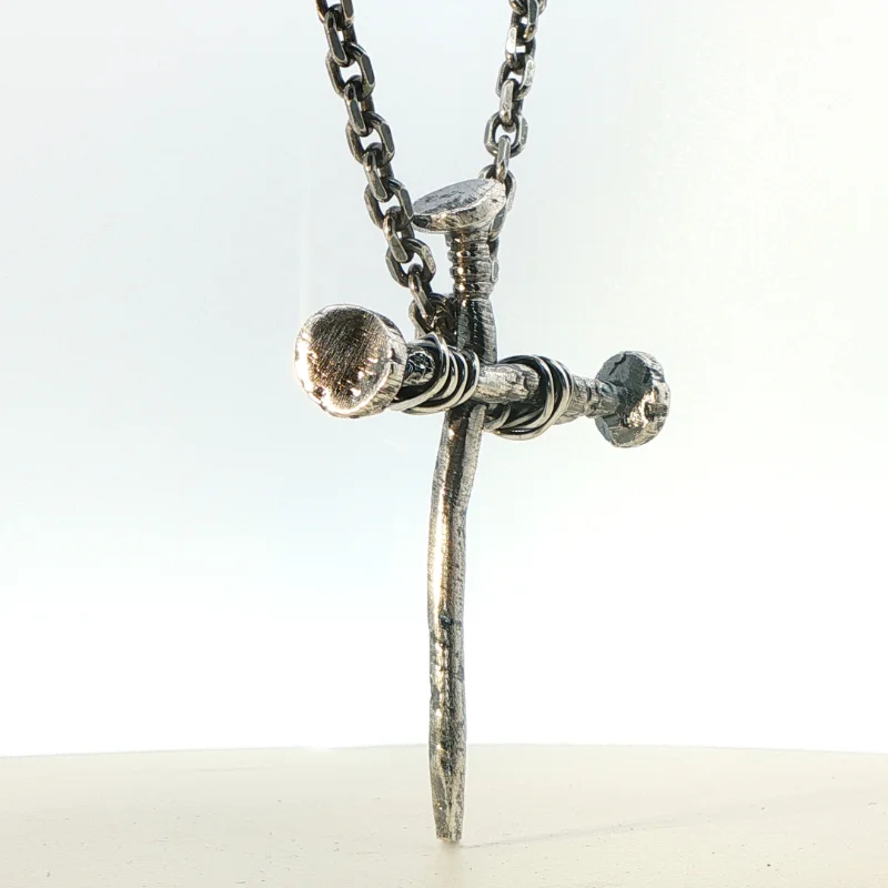 Se trata de 3 clavos unidos por hilo de plata, elaboración artesanal y diseño unisex, donde aplicamos diferentes texturas para resaltar las propiedades de este metal noble.