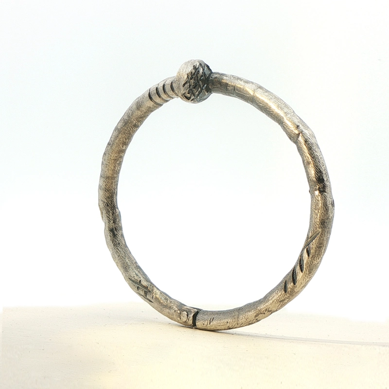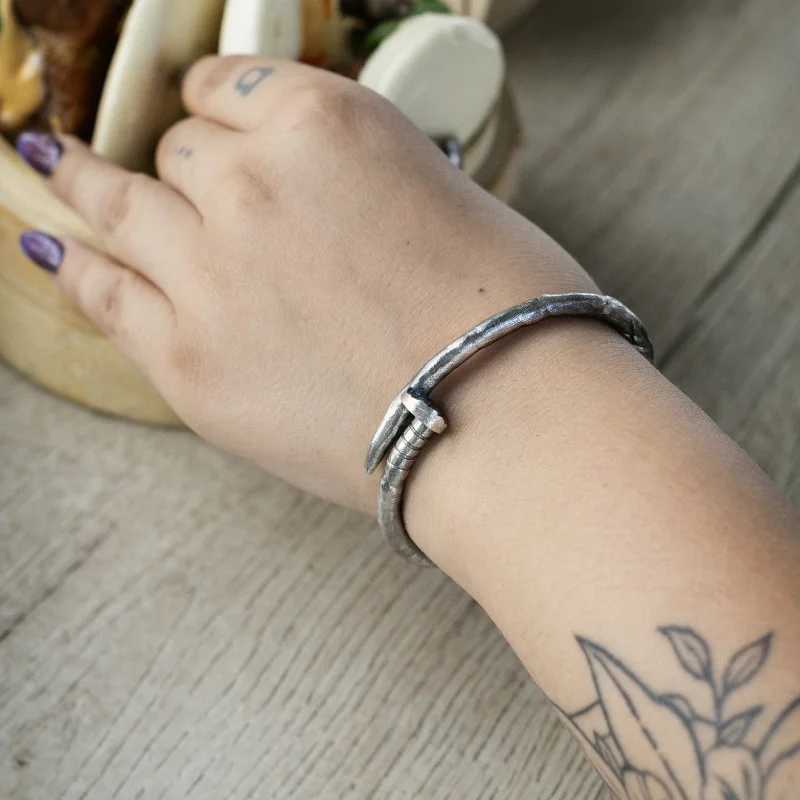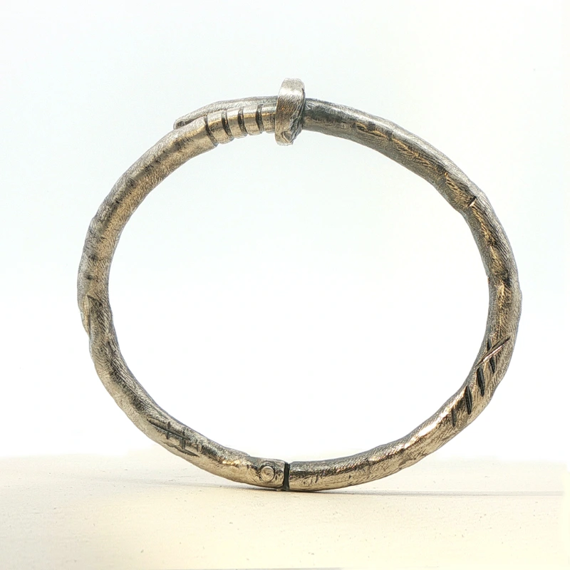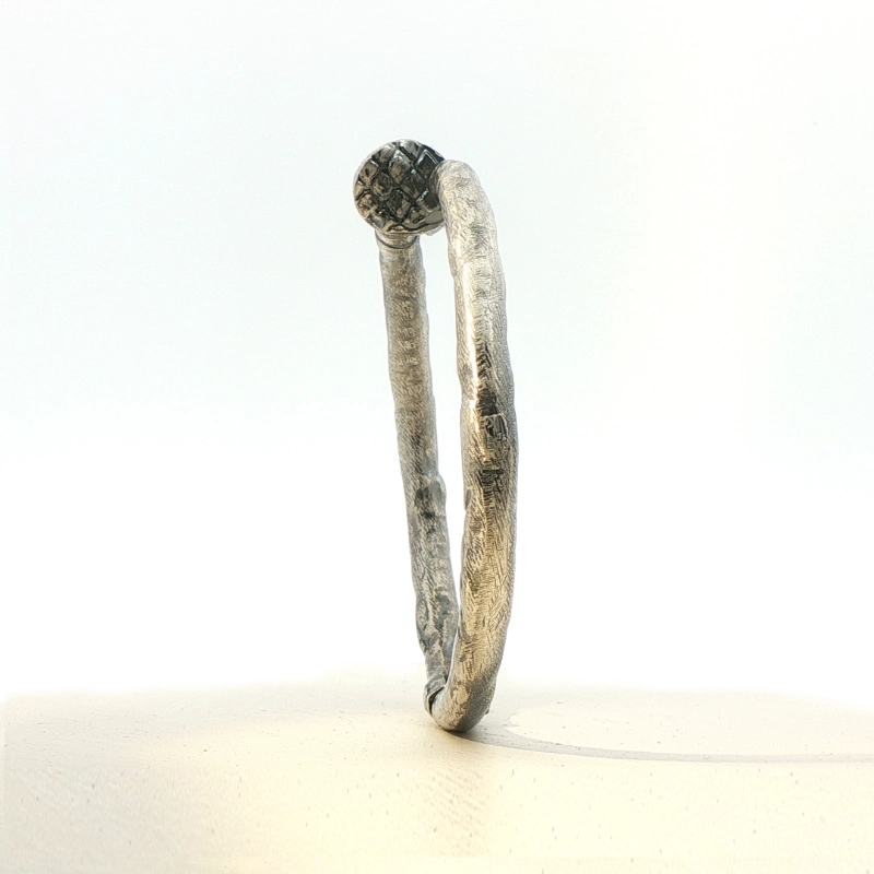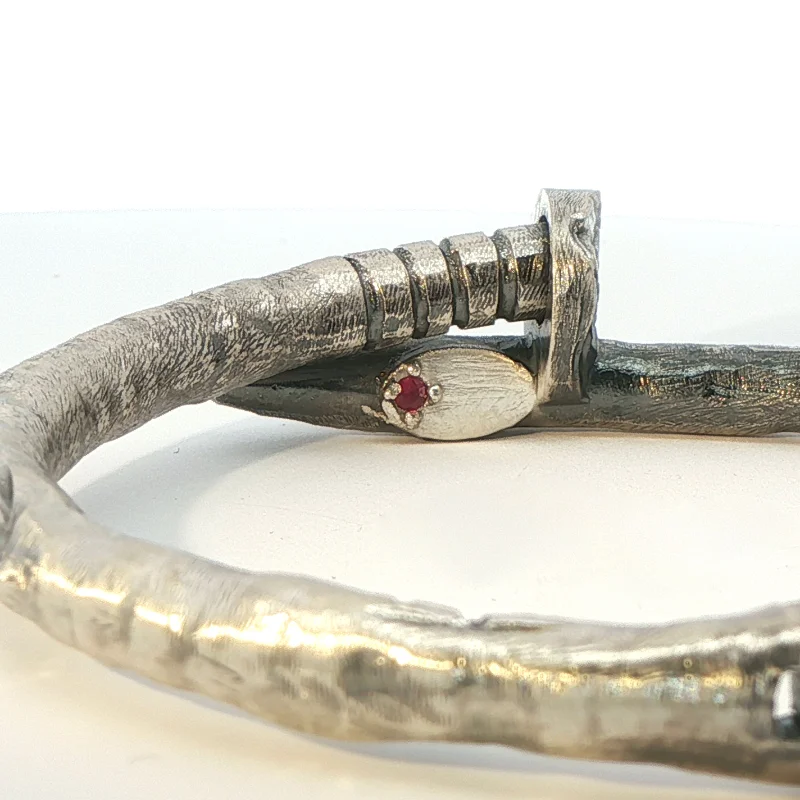 El metal noble que la compone está machacado hasta su límite de torsión con un destello de rubí natural interior. El complemento ideal, tanto si es el único protagonista de tu muñeca, decides acompañarlo con otras pulseras, o con un reloj.